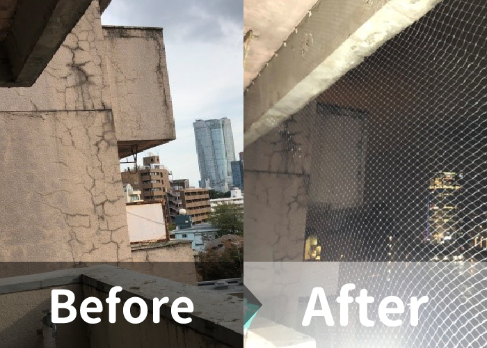べレンダは共有部分に含まれ穴をあけたりできませんが、接着剤でネットを設置してもらいました。